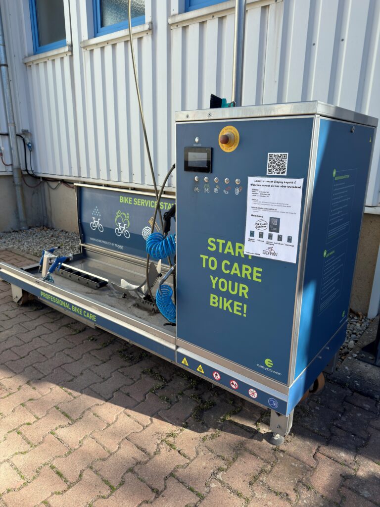 Unsere Bike-Waschstation steht euch ebenfalls rund um die Uhr zur Verfügung. Einfach vorbeikommen, reinigen und direkt wieder startklar machen.